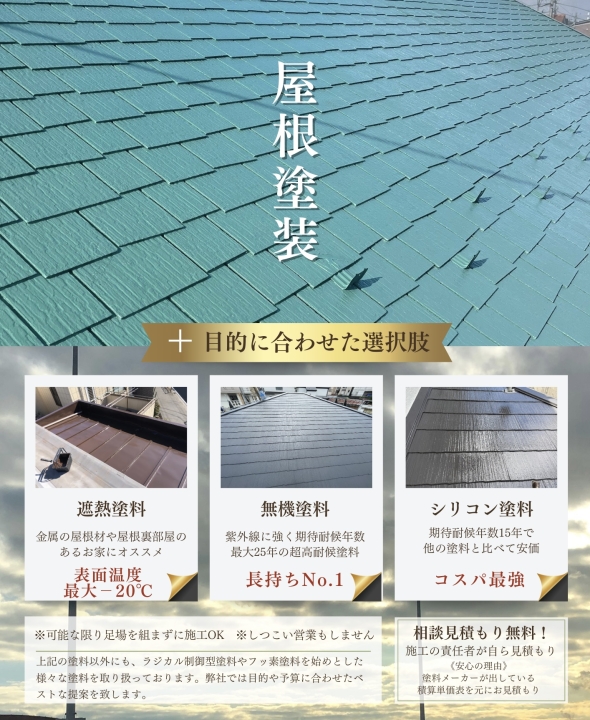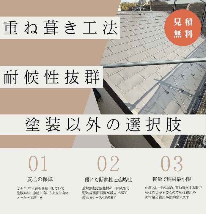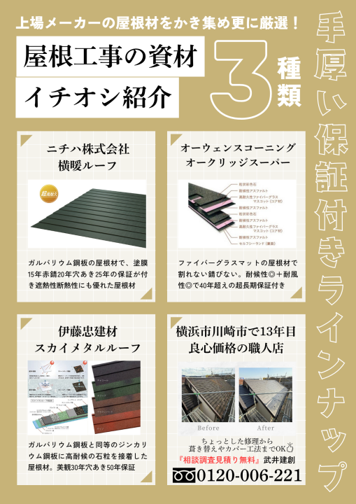 武井建創ではそのような方の為に、上場しているメーカーの屋根材の中から更に手厚い保証が付く物に厳選し、お勧めしております!